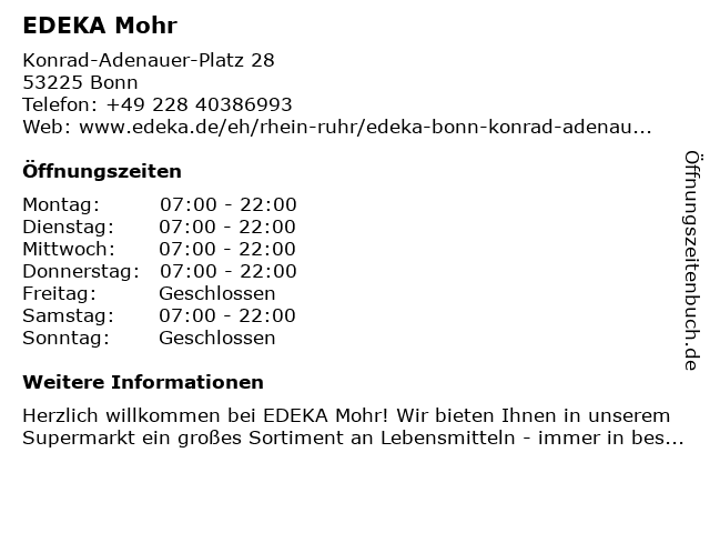 | Öffnungszeiten EDEKA Mohr in Bonn anzeigen | |