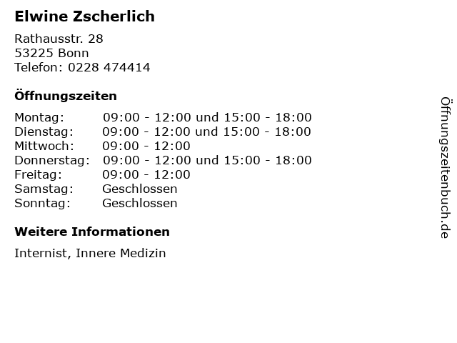 | Öffnungszeiten Elwine Zscherlich in Bonn anzeigen | |
