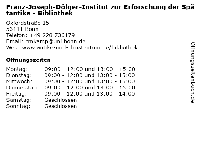 Branchen & Suchbegriffe zu Franz-Joseph-Dölger-Institut zur Erforschung der Spätantike - Bibliothek:bibliothek, buch, buchscanner, dölger, erforschung, franz, institut, joseph, literaturen, sprachen, spätantike, zur |