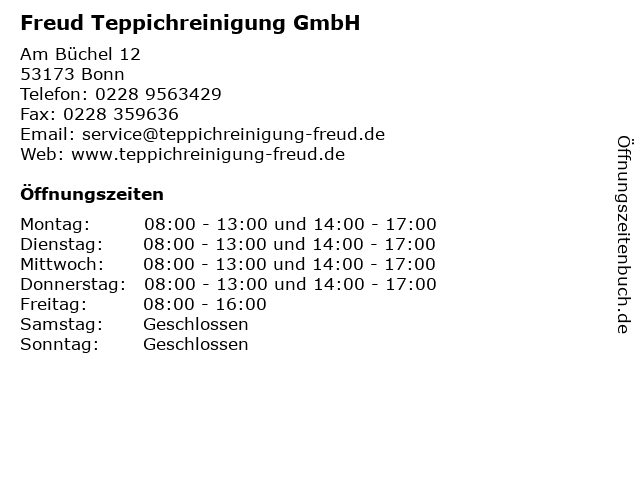 | Öffnungszeiten Freud Teppichreinigung GmbH in Bonn anzeigen | |