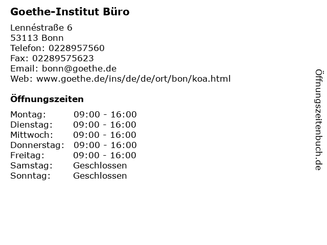 | Öffnungszeiten Goethe-Institut Büro in Bonn anzeigen | |