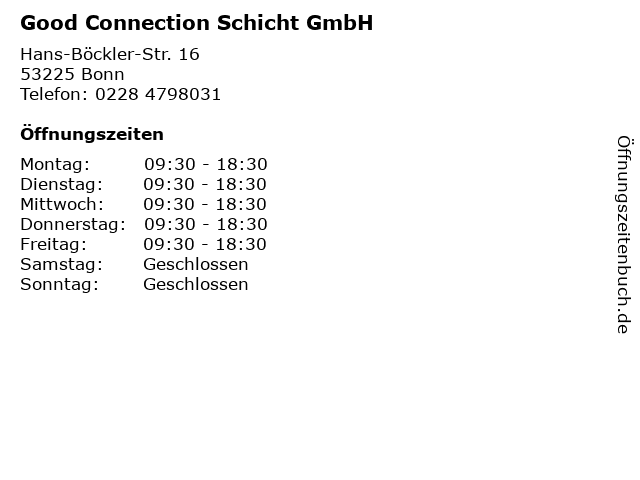 | Öffnungszeiten Good Connection Schicht GmbH in Bonn anzeigen | |