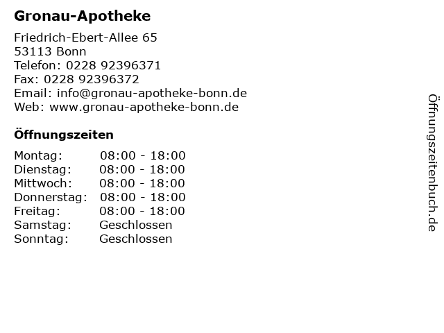 | Öffnungszeiten Gronau-Apotheke in Bonn anzeigen | |