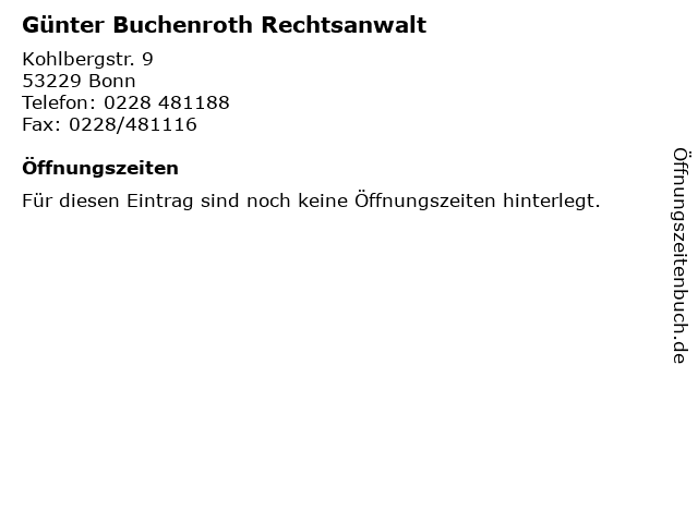 | Öffnungszeiten Günter Buchenroth Rechtsanwalt in Bonn anzeigen | |