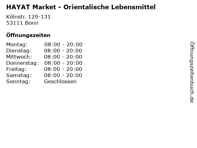 | Öffnungszeiten HAYAT Market - Orientalische Lebensmittel in Bonn anzeigen | |