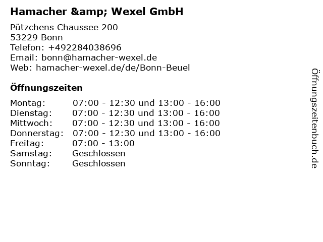 | Öffnungszeiten Hamacher & Wexel GmbH in Bonn anzeigen | |
