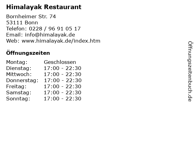 | Öffnungszeiten Himalayak Restaurant in Bonn anzeigen | |