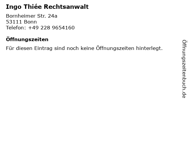| Öffnungszeiten Ingo Thiée Rechtsanwalt in Bonn anzeigen | |
