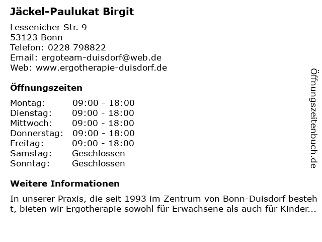 | Öffnungszeiten Jäckel-Paulukat Birgit in Bonn anzeigen | |