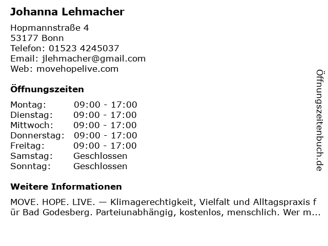 | Öffnungszeiten Johanna Lehmacher in Bonn anzeigen | |