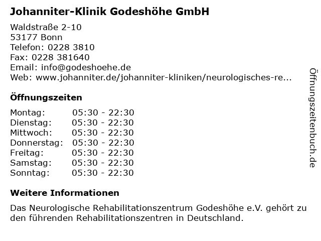 | Öffnungszeiten Johanniter-Klinik Godeshöhe GmbH in Bonn anzeigen | |