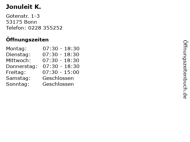 | Öffnungszeiten Jonuleit K. in Bonn anzeigen | |