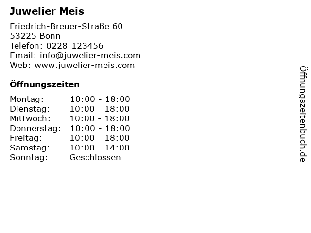 | Öffnungszeiten Juwelier Meis in Bonn anzeigen | |
