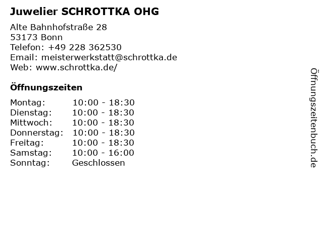 | Öffnungszeiten Juwelier SCHROTTKA OHG in Bonn anzeigen | |