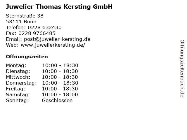 | Öffnungszeiten Juwelier Thomas Kersting GmbH in Bonn anzeigen | |