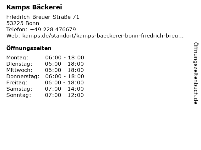 | Öffnungszeiten Kamps Bäckerei in Bonn anzeigen | |