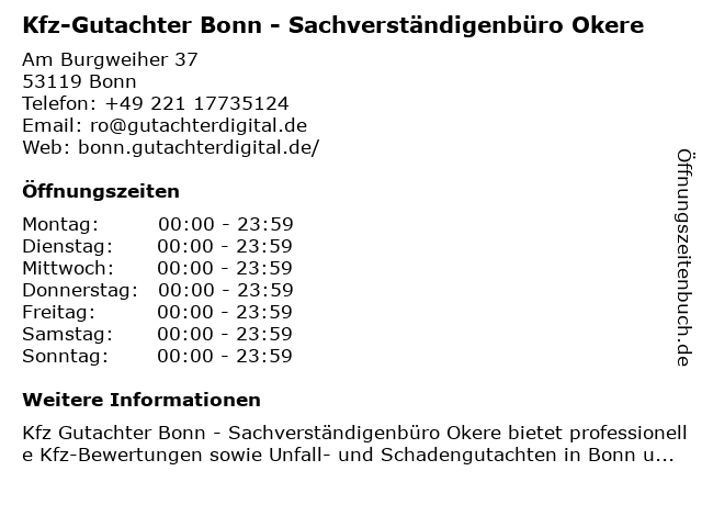 3 Sachverständigenbüro für Elektrotechnik - Dipl.-Ing. Ralph Schweda (Entfernung: 2,44 km) Grootestraße 24, 53121 Bonn 4 KFZ Gutachter Bonn | Ing. & Kfz Sachverständigenbüro Kajtazi (Entfernung: 2,74 km) Kleine Str. 35, 53121 Bonn 6 Dr. med. P. Isenböck - Internist, Hausarzt, Psychotherapeut, Gutachter (Entfernung: 3,68 km) Meckenheimer Allee 77, 53115 Bonn |