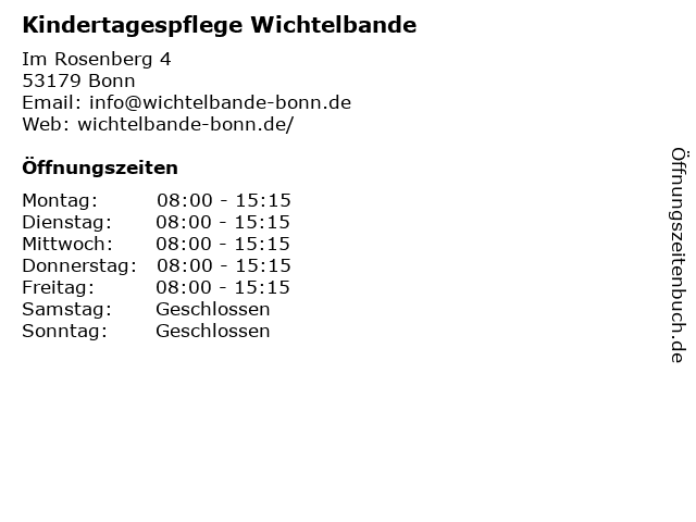 | Öffnungszeiten Kindertagespflege Wichtelbande in Bonn anzeigen | |