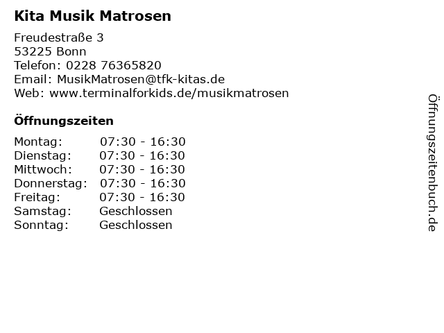 | Öffnungszeiten Kita Musik Matrosen in Bonn anzeigen | |