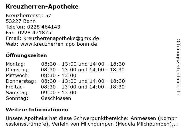| Öffnungszeiten Kreuzherren-Apotheke in Bonn anzeigen | |
