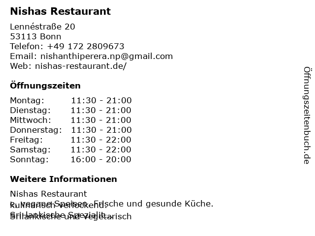 | Öffnungszeiten Nishas Restaurant in Bonn anzeigen | |