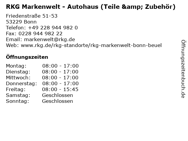 3 RKG Autohandel GmbH & Co.KG Alfa Romeo Verkauf Service (Entfernung: 0,04 km) Friedenstr. 51, 53229 Bonn 6 RKG Autohandel GmbH & Co. KG - Service, Teile & Zubehör (Entfernung: 3,19 km) Friedensstraße 53, 53229 Bonn |