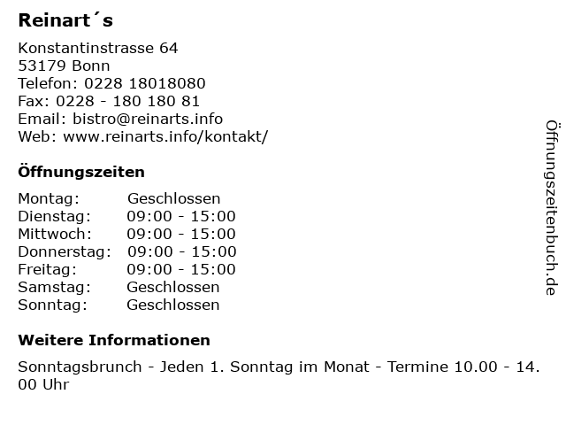 | Öffnungszeiten Reinart´s in Bonn anzeigen | |