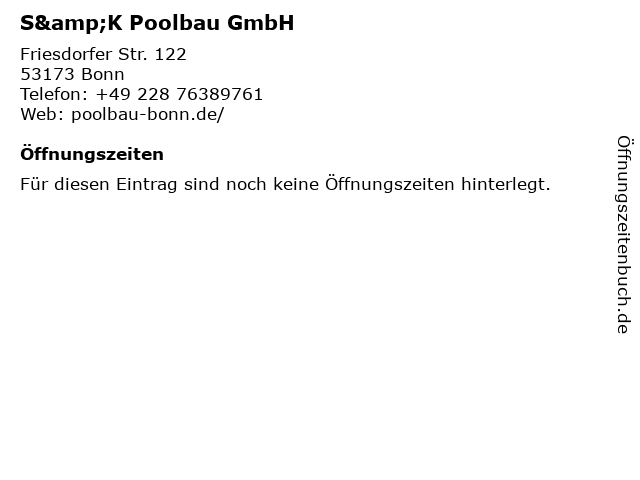 | Öffnungszeiten S&K Poolbau GmbH in Bonn anzeigen | |