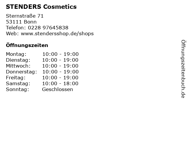 | Öffnungszeiten STENDERS Cosmetics in Bonn anzeigen | |