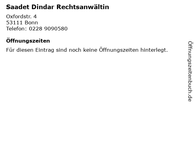 | Öffnungszeiten Saadet Dindar Rechtsanwältin in Bonn anzeigen | |