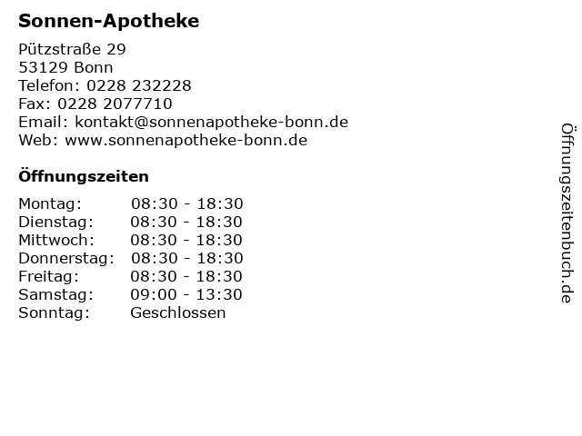 | Öffnungszeiten Sonnen-Apotheke in Bonn anzeigen | |