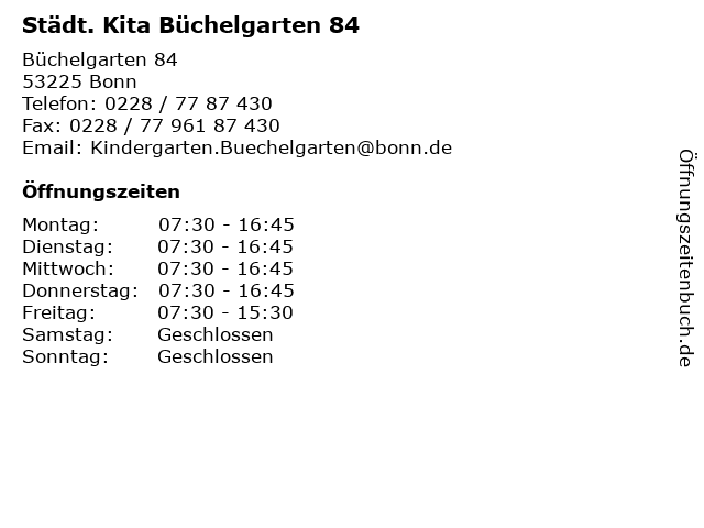| Öffnungszeiten Städt. Kita Büchelgarten 84 in Bonn anzeigen | |