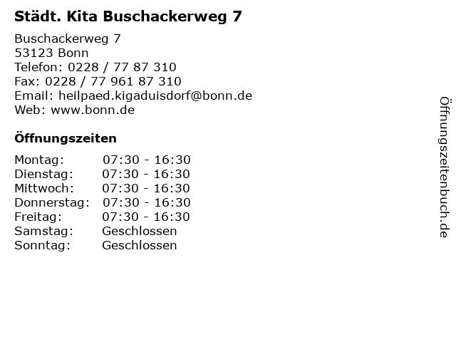 | Öffnungszeiten Städt. Kita Buschackerweg 7 in Bonn anzeigen | |