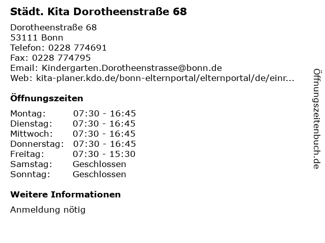 | Öffnungszeiten Städt. Kita Dorotheenstraße 68 in Bonn anzeigen | |