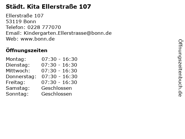 | Öffnungszeiten Städt. Kita Ellerstraße 107 in Bonn anzeigen | |