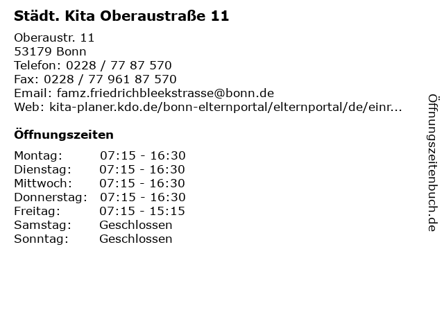 | Öffnungszeiten Städt. Kita Oberaustraße 11 in Bonn anzeigen | |