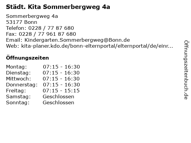 | Öffnungszeiten Städt. Kita Sommerbergweg 4a in Bonn anzeigen | |