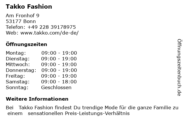 | Öffnungszeiten Takko Fashion in Bonn anzeigen | |