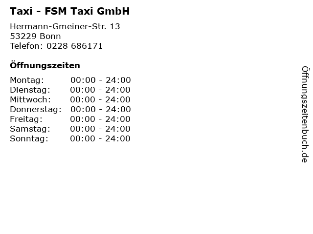| Öffnungszeiten Taxi - FSM Taxi GmbH in Bonn anzeigen | |