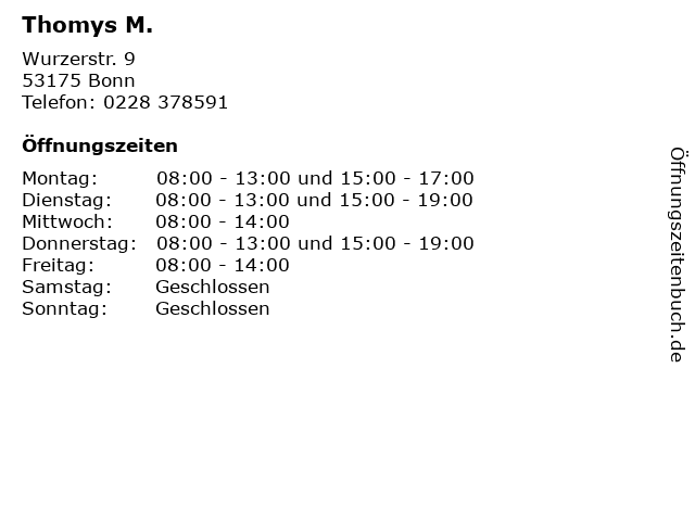 | Öffnungszeiten Thomys M. in Bonn anzeigen | |