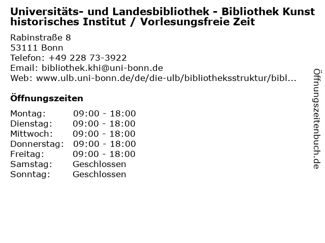 1 Universitäts- und Landesbibliothek - Bibliothek Kunsthistorisches Institut (Entfernung: 0,00 km) Rabinstraße 8, 53111 Bonn 2 Universitäts- und Landesbibliothek Bonn - Fachbibliothek Philologien (Entfernung: 0,00 km) Rabinstr. 8, 53111 Bonn 5 Dr.med. E. Neusel Institut für Medizinische Begutachtung (Entfernung: 0,32 km) Wittelsbacherring 11, 53115 Bonn 6 |