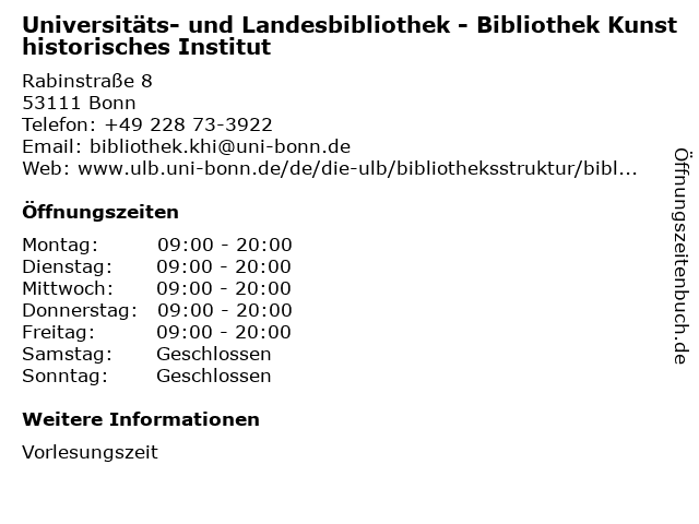 1 Universitäts- und Landesbibliothek - Bibliothek Kunsthistorisches Institut / Vorlesungsfreie Zeit (Entfernung: 0,00 km) Rabinstraße 8, 53111 Bonn 2 Universitäts- und Landesbibliothek Bonn - Fachbibliothek Philologien (Entfernung: 0,00 km) Rabinstr. 8, 53111 Bonn 5 Dr.med. E. Neusel Institut für Medizinische Begutachtung (Entfernung: 0,32 km) Wittelsbacherring 11, 53115 Bonn 6 ASA Institut für Sektoranalyse und Politikberatung GmbH (Entfernung: 0,40 km) Meckenheimer Allee 67, 53115 Bonn |