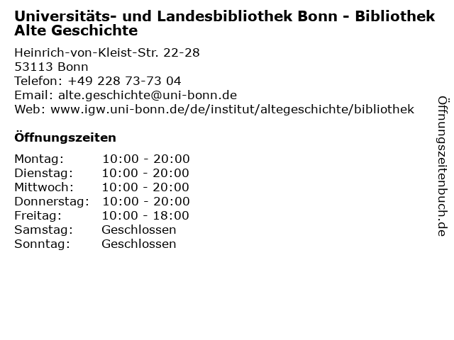 Branchen & Suchbegriffe zu Universitäts- und Landesbibliothek Bonn - Bibliothek Alte Geschichte:alte, bibliothek, buch, buchscanner, geschichte, landesbibliothek, literaturen, sprachen, universitäts |