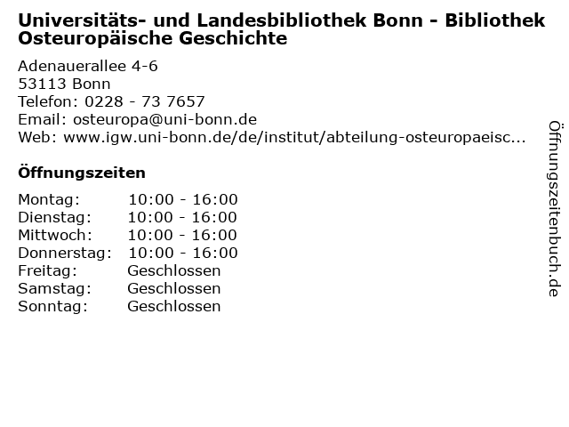 Branchen & Suchbegriffe zu Universitäts- und Landesbibliothek Bonn - Bibliothek Osteuropäische Geschichte:bibliothek, buch, buchscanner, geschichte, landesbibliothek, literaturen, osteuropäische, sprachen, universitäts |