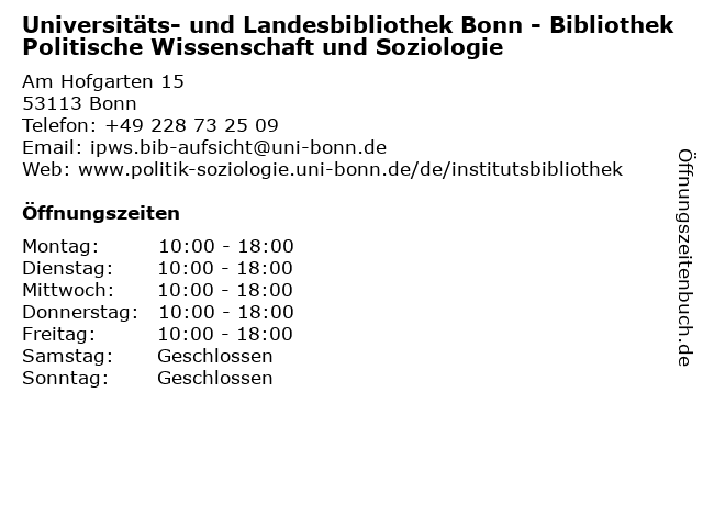 Branchen & Suchbegriffe zu Universitäts- und Landesbibliothek Bonn - Bibliothek Politische Wissenschaft und Soziologie:bibliothek, buch, buchscanner, landesbibliothek, literaturen, politische, soziologie, sprachen, universitäts, wissenschaft |