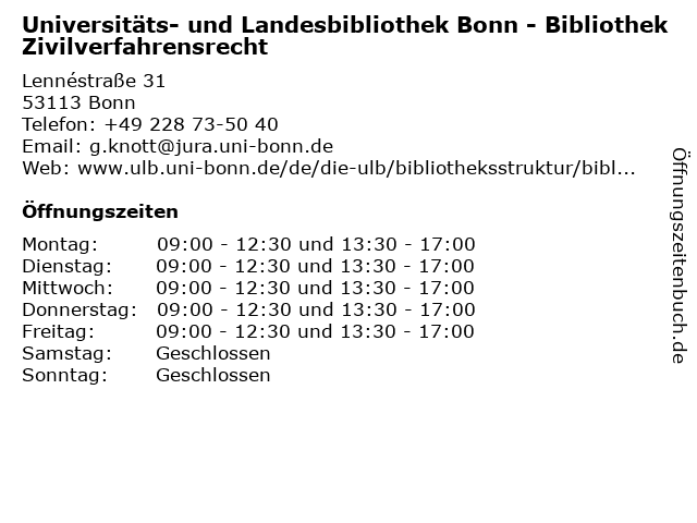 Branchen & Suchbegriffe zu Universitäts- und Landesbibliothek Bonn - Bibliothek Zivilverfahrensrecht:bibliothek, buch, buchscanner, landesbibliothek, literaturen, sprachen, universitäts, zivilverfahrensrecht |