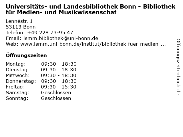 Branchen & Suchbegriffe zu Universitäts- und Landesbibliothek Bonn - Bibliothek für Medien- und Musikwissenschaf:bibliothek, buch, buchscanner, landesbibliothek, literaturen, medien, musikwissenschaf, sprachen, universitäts |