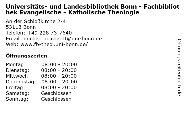 Branchen & Suchbegriffe zu Universitäts- und Landesbibliothek Bonn - Fachbibliothek Evangelische - Katholische Theologie:bibliothek, buch, buchscanner, evangelische, fachbibliothek, katholische, landesbibliothek, literaturen, sprachen, theologie, universitäts |
