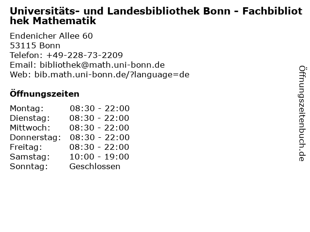 Branchen & Suchbegriffe zu Universitäts- und Landesbibliothek Bonn - Fachbibliothek Mathematik:bibliothek, buch, buchscanner, fachbibliothek, landesbibliothek, literaturen, mathematik, sprachen, universitäts |