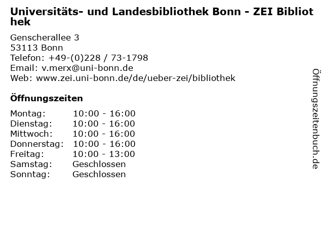 1 Universität Bonn - Zentrum für Europäische Integrationsforschung, Bibliothek (Entfernung: 0,02 km) Walter-Flex-Strasse 3, 53113 Bonn 4 Universitäts- und Landesbibliothek Bonn - Bibliothek Altkatholisches Seminar (Entfernung: 2,06 km) Adenauerallee 33, 53113 Bonn 5 Universitäts- und Landesbibliothek Bonn - Bibliothek Alte Geschichte (Entfernung: 2,07 km) Heinrich-von-Kleist-Str. 22-28, 53113 Bonn 6 Universitäts- und Landesbibliothek Bonn - Bibliothek Altamerikanistik (Entfernung: 2,86 km) Oxfordstraße 15, 53111 Bonn |
